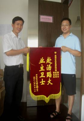 为感谢管理处及时发现火情和灭火, 刘女士特制作“赴汤蹈火,业主卫士”锦旗到管理处致谢。
